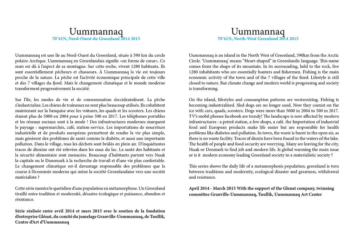 Série réalisée entre avril 2014 et mars 2015 avec le soutien de la fondation d’entreprise Glénat, du comité du jumelage Granville-Uummannaq, de Tuullik, Centre d’Art d’Uummannaq